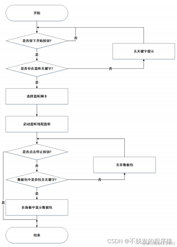 嗅探器扫描是对所接收到的所有数据包进行实时监听,然后依次与监测关键字进行匹配,筛选出那些关键信息。其流程图如下图所示: