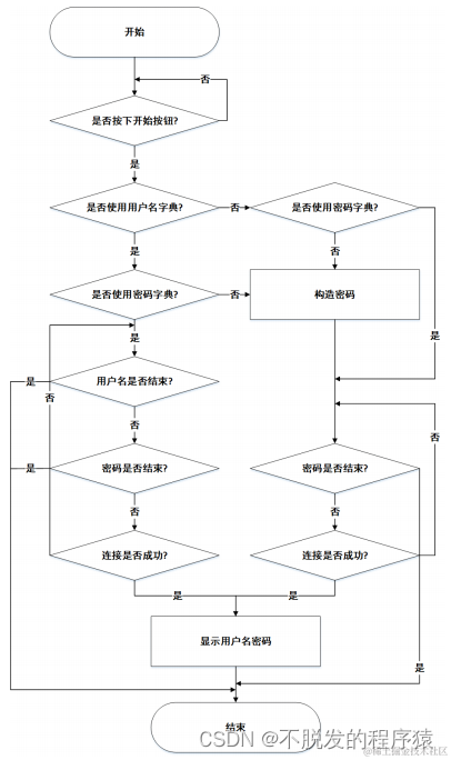 弱密码扫描是逐个对目标主机的用户名和密码进行扫描,依次穷举遍历所有的用户名和密码的组合,用遍历生成的密码去逐次尝试验证。通过密码验证系统给出的正确或错误的反馈来判断是否成功获取到了用户的信息。其流程图如下图所示: