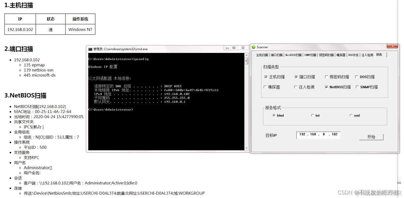 - 实现一些基本的扫描任务,如读取到目的主机的软硬件信息,开放的端口等等。