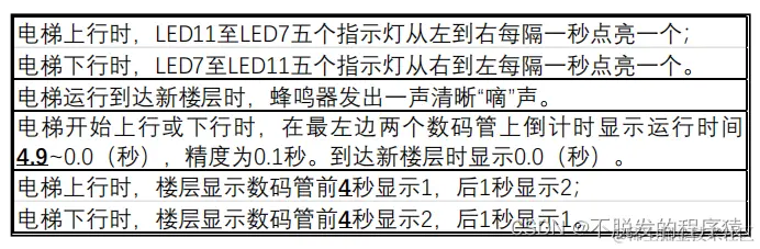 - 译码显示及流水指示灯:作为显示电梯不同变量的板块,其中包括位选和段选。完成不同情况的位选和对应的数字的段选。例如电梯的楼层和运行状态,同时还完成上下行的LED 依次点亮的附加功能。