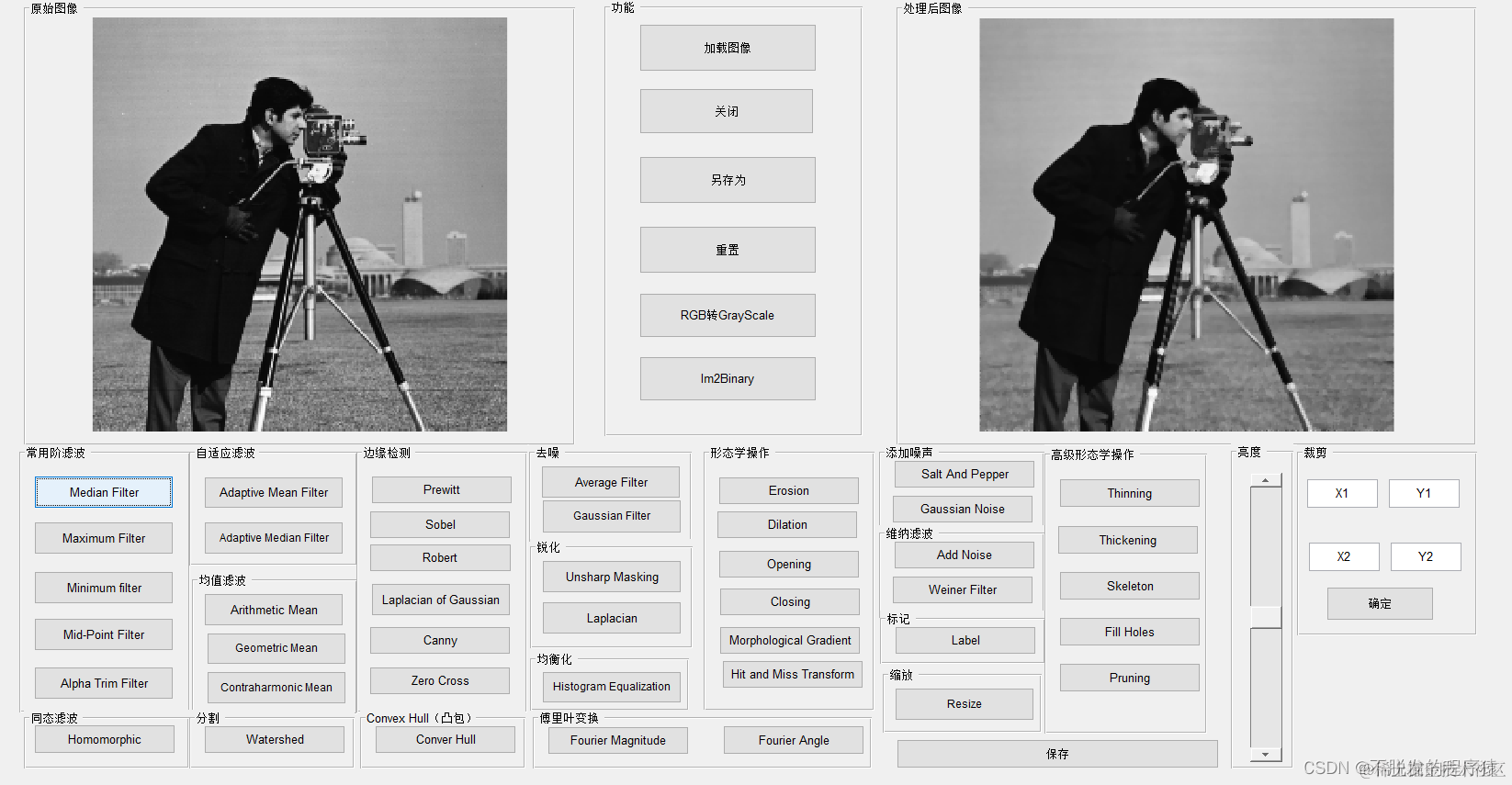 选择图像增强功能,载入实验图像,选择不同的滤波器,观察图像处理结果,改变滤波器模板,比较图像处理结果,效果如下图所示: