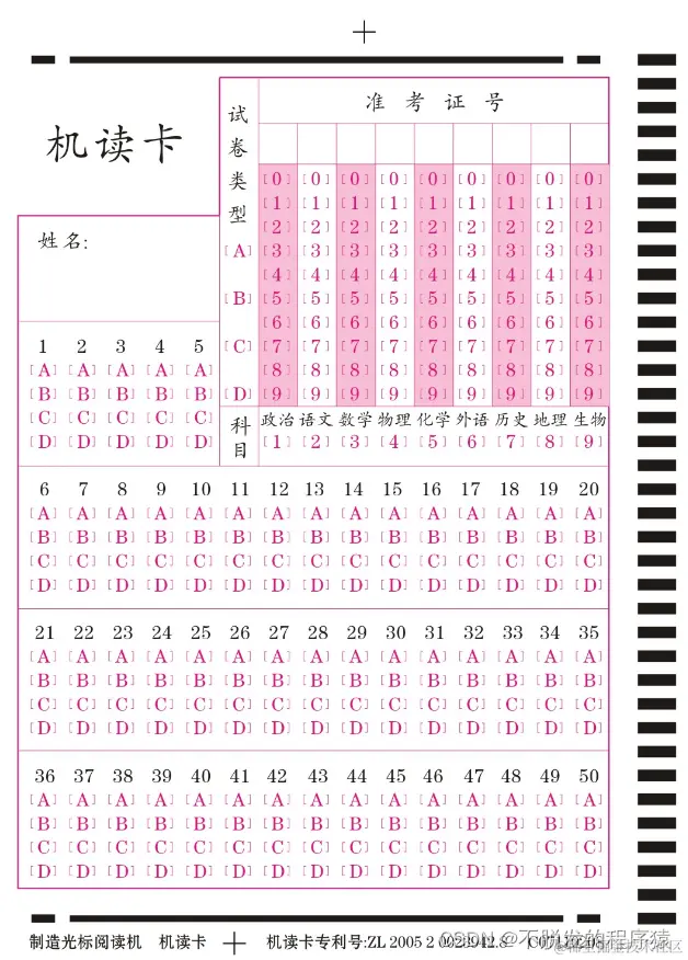 每种答题卡都有很明显的助识别标记,像下图中的这种,最右边的一竖溜小横杠是帮助定位选项的,还有准考证号下方的横线、最下边的横线是用来矫正图像的。