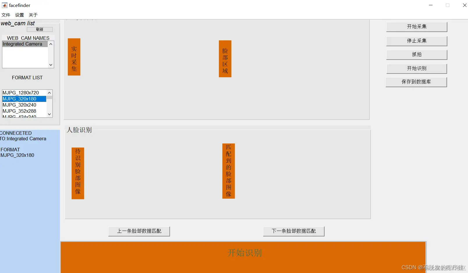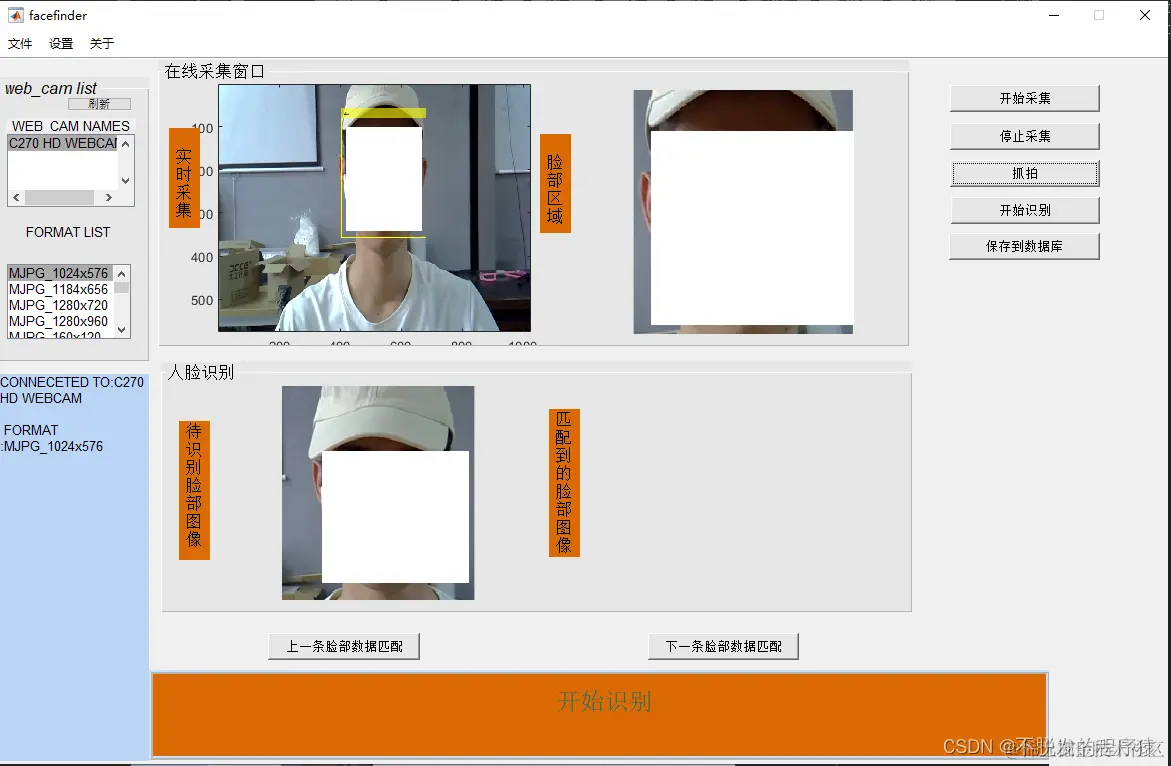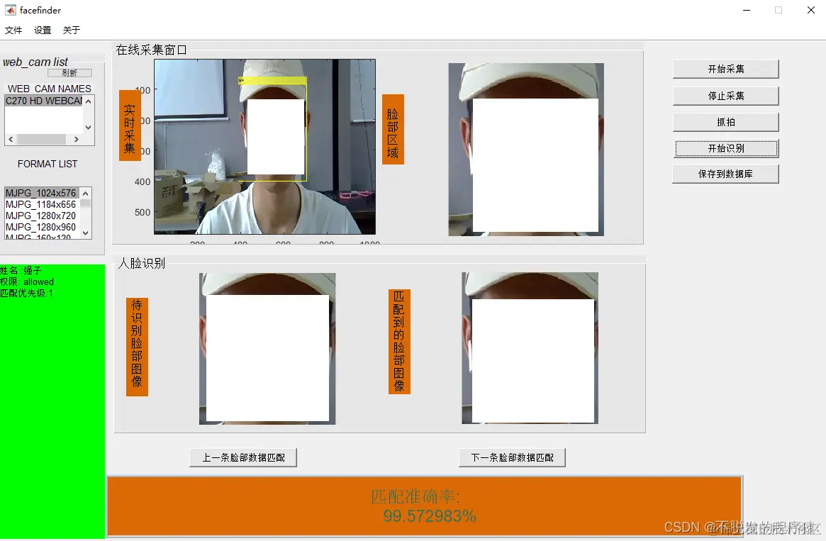 点击返回到识别页面,再次点击开始采集按钮,抓拍人脸图像,进行识别,结果如下图所示: