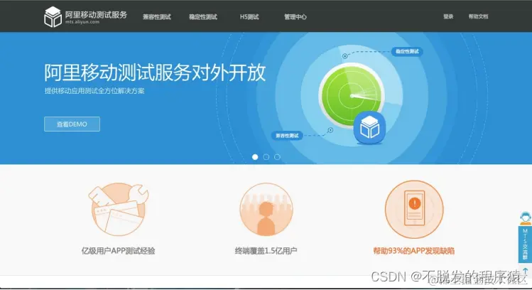 这里使用阿里移动测试服务对本应用进行基本的兼容性测试,地址是http://mts.aliyun.com。阿里移动测试服务是为广大移动开发者提供真机测试服务的云平台,拥有大量热门机型,提供7x24全天候服务。能够帮助开发者以最低的成本、最高的效率发现APP中的各类隐患,包括APP崩溃、各类兼容性、功能性、性能问题等。网站界面如下图所示: