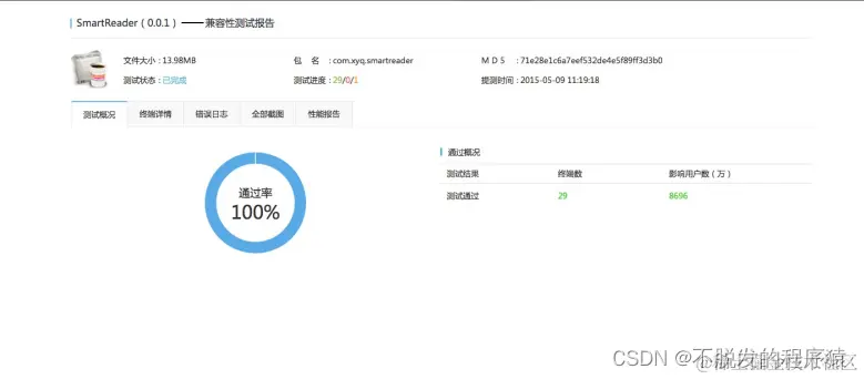 测试使用的手机设备包括三星、华为、小米和魅族一共30部手机,测试的Android操作系统版本从4.0.4 到4.4.4,已经涵盖了市面上大多数的Android热门机型,因此其测试结果也是具有一定的实际意义的。本应用的兼容性测试结果如下图所示: