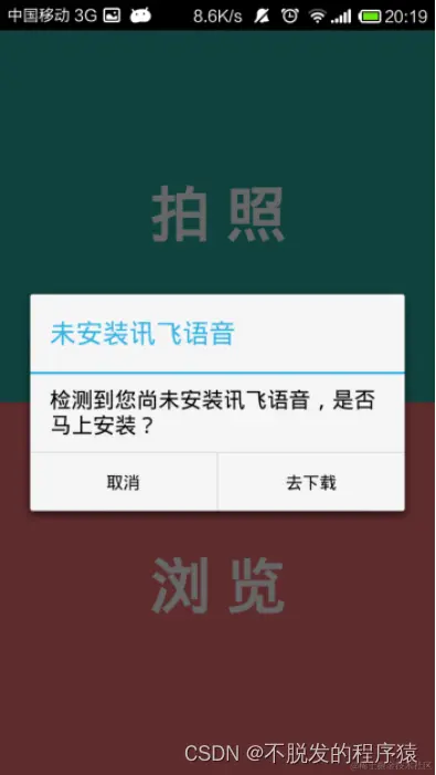 用户打开该应用后,程序会自动检测手机中是否安装讯飞语音,该语音引擎在朗读文字的时候需要用到。如果检测到用户尚未安装,会弹出对话框提醒用户安装。安装完成后可以选择“拍照”或者“浏览”功能。
