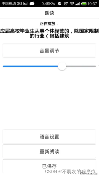 在文字识别完成后,程序会自动跳转到朗读的界面。该界面会显示新闻的标题,并提供音量调节功能,拖动音量条即可对朗读的音量进行实时调节,并且程序会记录用户上一次所使用的音量大小,避免每次朗读时都要手动调大音量的麻烦。