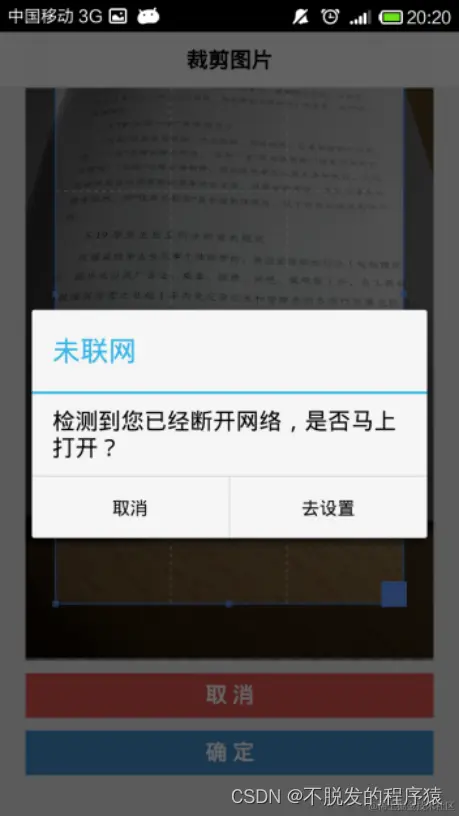 选择“拍照”后,程序调用系统自带的相机供用户拍摄报纸内容,待拍照完成后,跳转至图片裁剪界面。在该界面中会将用户在上一步拍摄的照片显示出来,并在图片中提供一个可任意方向及大小拖动的方框,用户可拖动该方框选出需要识别的图片部分。裁剪完成后点击“确定”即开始进行文字识别。由于该识别过程需要联网,如果发现用户为接入互联网会弹出对话框提醒用户进行相关设置。