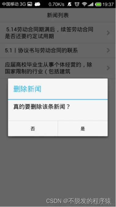 | 17 | 在新闻列表删除新闻 | 测试可否在新闻列表删除新闻 | 在新闻列表长按新闻条目,观察是否会有对话框弹出提醒确认删除,以及删除后再次进入新闻列表页面,观察该条新闻可否被找到 |