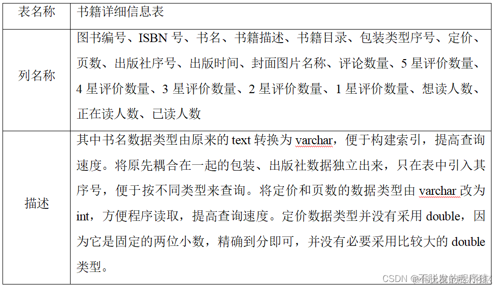 book_publishing_info表存储了图书的出版信息,分为图书编号、ISBN号、书名、作者姓名、图书描述、图书目录、包装类型、定价、总页数、出版社名称、出版时间以及图书封面缩略图名称这十二列。作者姓名与book_author_info表的作者姓名列重复,而定价、总页数等数据使用varchar来存储,出版社也没有构建序号,不便于检索,所以这些内容都需要清洗整理。
