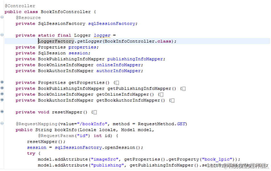 controller类将SqlSessionFactory使用注解的方式注入类中,并且使用注解来实现Controller类与请求映射。使用Log4j工具来输出日志。借鉴Objective-C的方式,使用setter/getter方法来获取变量,以便延迟加载以及提高利用率。
