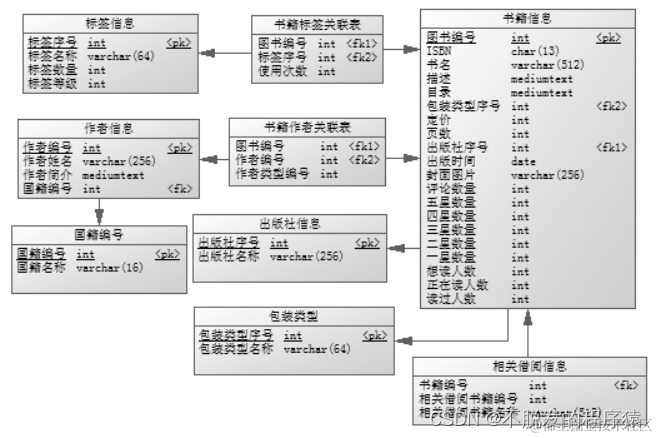 清洗后的数据库是可以直接拿来网站使用的,从原始数据库中数据清洗整合出来的数据,分为九张表:book_info,tag_info,book_tag_relation,author_info,book_author_relation,nationality_info,publisher_info,binding_type,book_relation,内容如下表所示: