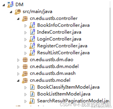 按照总体设计阶段的分层,将系统分为三个包:cn.edu.ustb.controller、cn.edu.ustb.dm、cn.edu.ustb.model。