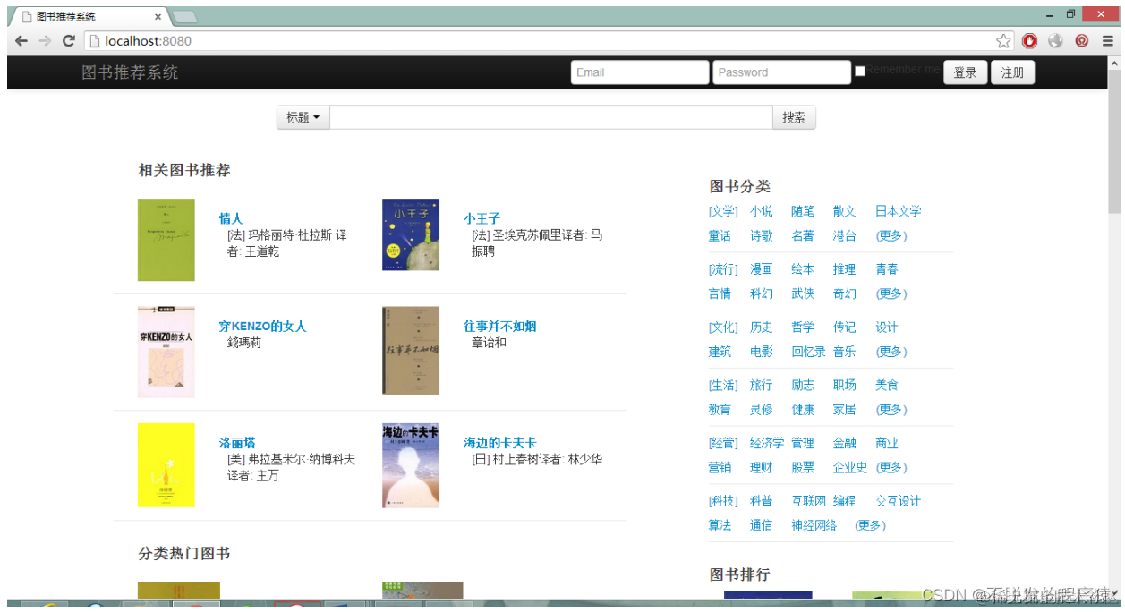 本项目是要开发一套轻量级、功能完善的基于Web的图书推荐系统展示平台。利用此平台,对图书信息进行展示与推荐,对用户提供注册与登录功能。由于原始数据为从豆瓣依照网站网页结构抓取得来,并不适用于系统直接读取,于是需要将原始数据表格进行重新设计,遍历分离所需数据存入新设计的表中,使其可以更便捷的查询与处理。开发过程需要考虑Spring MVC框架,将功能按照模块、视图、控制器三部分分离,模块与视图适度的模块化使其可以较好的重用。beans使用注解来注入,这样可以提高小的个人项目的开发效率。在开发开始,配置Maven来解决需要的依赖包,创建Git仓库,来控制版本。
