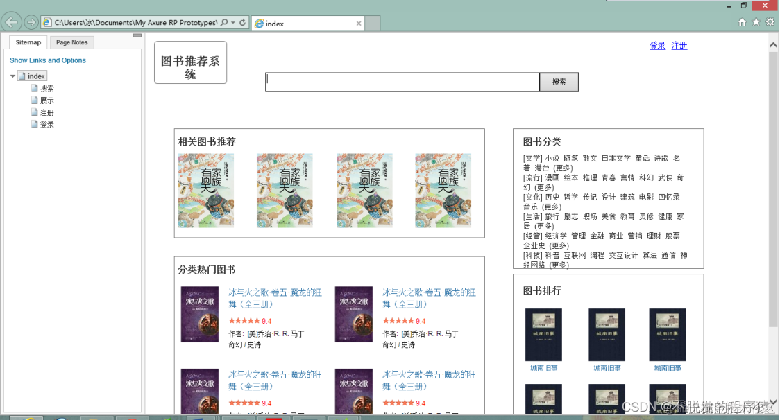 使用快速原型工具Axure RP Pro,根据功能设计了需要实现的页面的原型:首页、搜索结果页、图书展示页、注册页面、登录页面。生成的首页原型效果如下图所示: