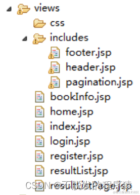 bookInfo.jsp负责显示图书的详细内容,index.jsp负责首页内容的显示,login和register负责登录与注册页面,resultList为搜索结果,只是单纯的搜索结果列表,用于分页时,通过AJAX请求来局部刷新,减少流量。resultListPag为搜索结果页面,是页面的框架,其中引入了resultList,作为第一次访问时,搜索结果的展示。