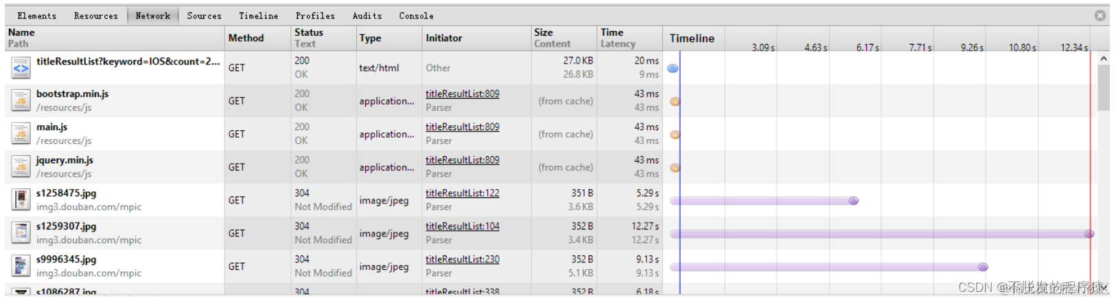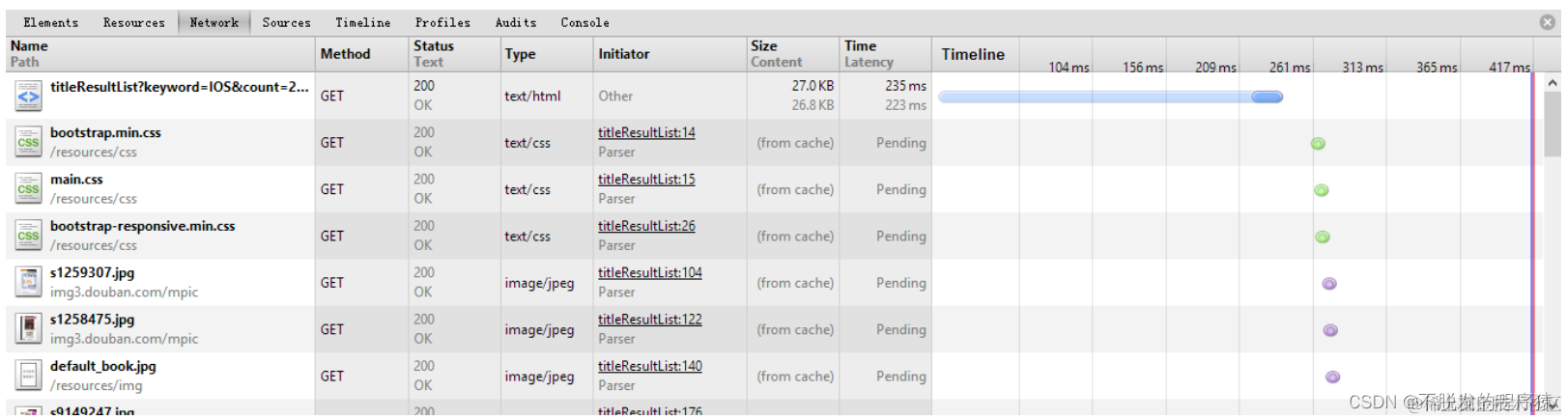 在查询结果页面,查询一个关键词“IOS”,页面的等待时间为223ms。同样由于缓存的作用,刷新的等待时长变为8ms。