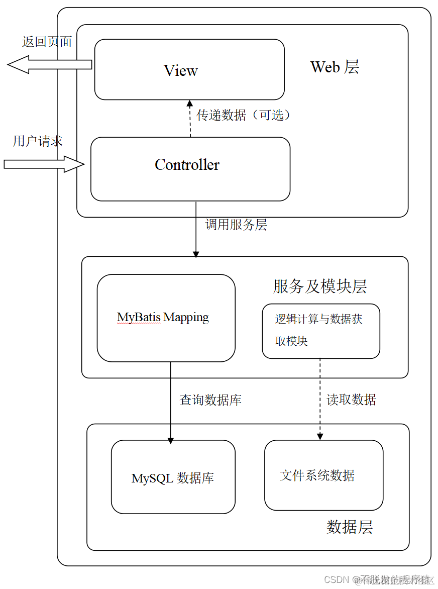 Web层负责处理用户的请求,其中Controller会接收DispatcherServlet分发过来的请求,Controller调用服务与模块层中的模块,进过逻辑计算,生成最终的数据,将数据通过键值对的方式,将视图通过字符串方式传递给DispatcherServlet,DispatcherServlet再读取对应的View,使用View作为模板,生成最终的页面,返回给用户。