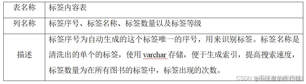book_online_info表存储图书的一些社会化信息,分为图书编号、标签、访问次数、5星评价数量、4星评价数量、3星评价数量、2星评价数量、1星评价数量、想读用户数量、在读用户数量、已读用户数量、还想阅读的书 这十二列。其中标签列将所有的标签,带上打标签的次数都放到了同一个字符串中,需要对其清洗。