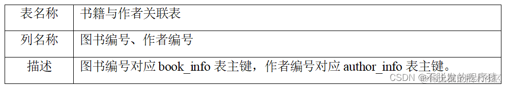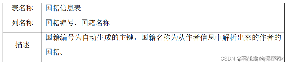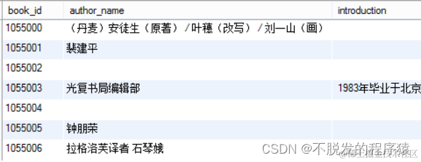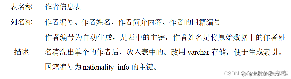 book_author_info表存储作者信息,分为图书编号、作者姓名、作者简介与介绍四列。作者简介内容包括作者的生平以及与此书和作者都有关的一些事件介绍,介绍列与前者相同。作者姓名列存储了各个作者加国籍的信息,需要进行清洗。