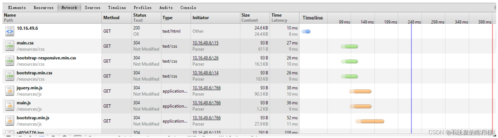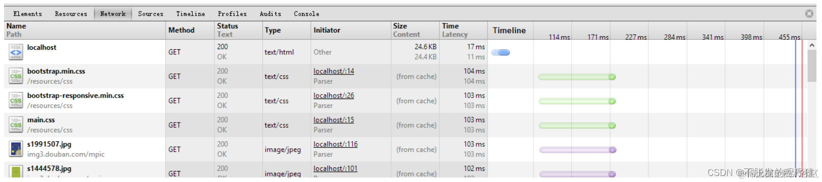 使用Chrome浏览器的开发者工具来进行测试。首次加载首页需要等待6ms,其它静态的css与js文件几乎不需要时间,在统计结果中,显示为0。之后刷新,Tomcat会从内存中直接取得返回结果。由下图可知,加载页面仅需要用时2ms。
