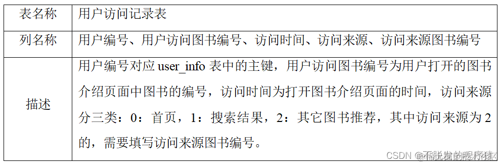 用户数据是用户的登陆注册以及访问记录的表。其中的数据为Web应用自己生成,而不是预先装入系统之中的,分为:user_info,user_visit_history,user_search_history,内容如下表所示: