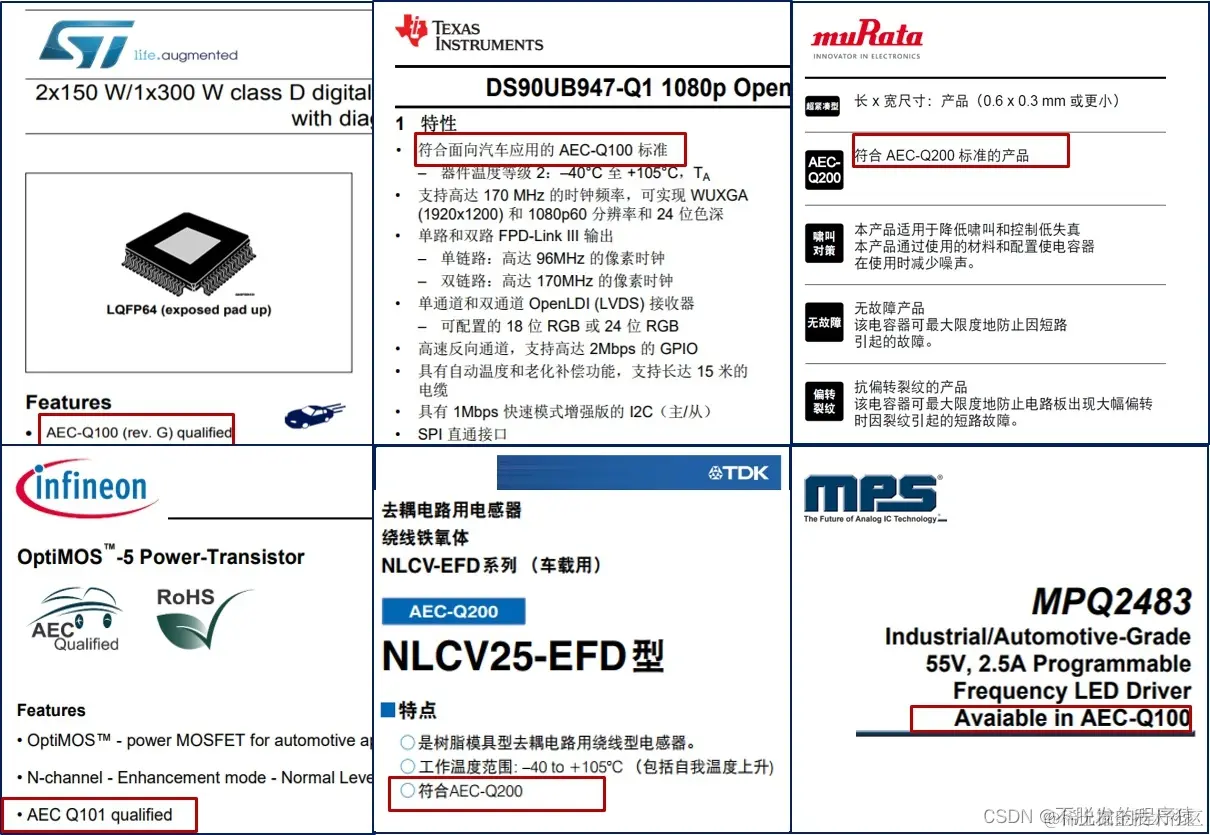 AEC-Q100适用于芯片,AEC-Q101适用于分立半导体器件,AEC-Q102适用于分立光电子器件,AEC-Q103适用于MEMS器件,AEC-Q104适用于多芯片模组,AEC-Q200适用于无源元件。