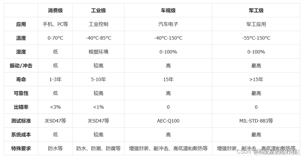 芯片按照应用场景,通常可以分为消费级、工业级、车规级和军工级四个等级,其要求依次为:军工>车规>工业>消费。