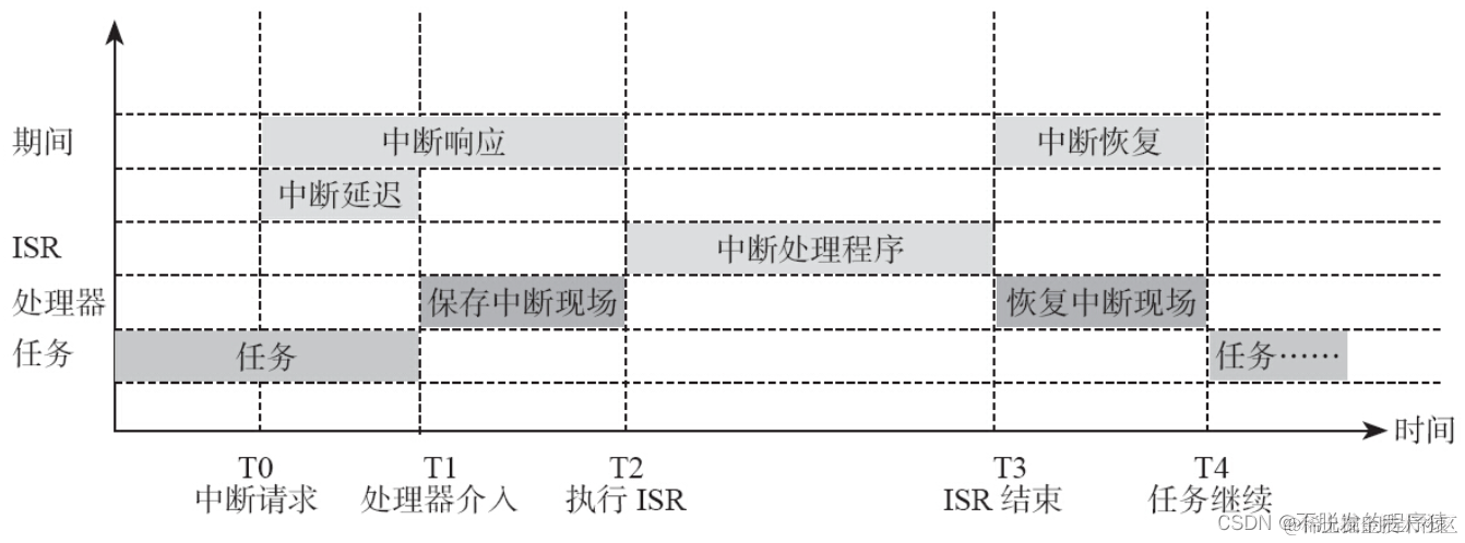详解FreeRTOS:嵌入式多任务系统的中断机制(理论篇—11) CSDN不脱发的程序猿 2023-06-16 128 阅读1分钟 目录 1、中断流程 2、中断嵌套 3、中断抢占机制 1、中断流程 不同处理器上的中断处理流程大致是相同的,但也有些细微差别,所以这里只介绍中断大概的几个阶段,如下图所示: T0时刻,用户程序正在执行,此时有外部设备产生中断请求; T1时刻,处理器开始处理外部中断,保存中断现场; T2时刻,处理器开始执行中断处理器函数; T3时刻,用户中断处理函