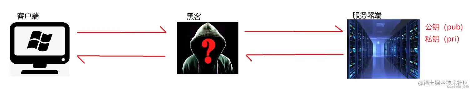 2.首先客户端向服务器端索要公钥,然后服务器端把公钥返回给客户端,此时如果中间有黑客劫持的话,他也得到了公钥pub;