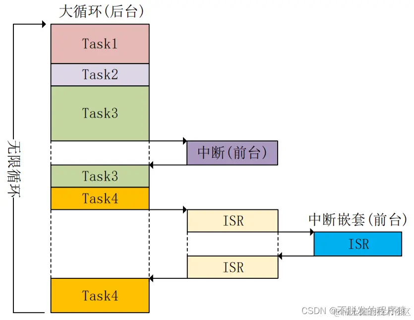 主程序依然是一段无限循环的代码,称为后台程序,而事件的响应则由中断来完成,称为前台程序。