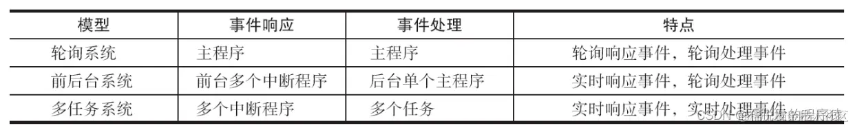 最后,对比一下三种嵌入式软件系统架构的特点和区别,如下表所示:
