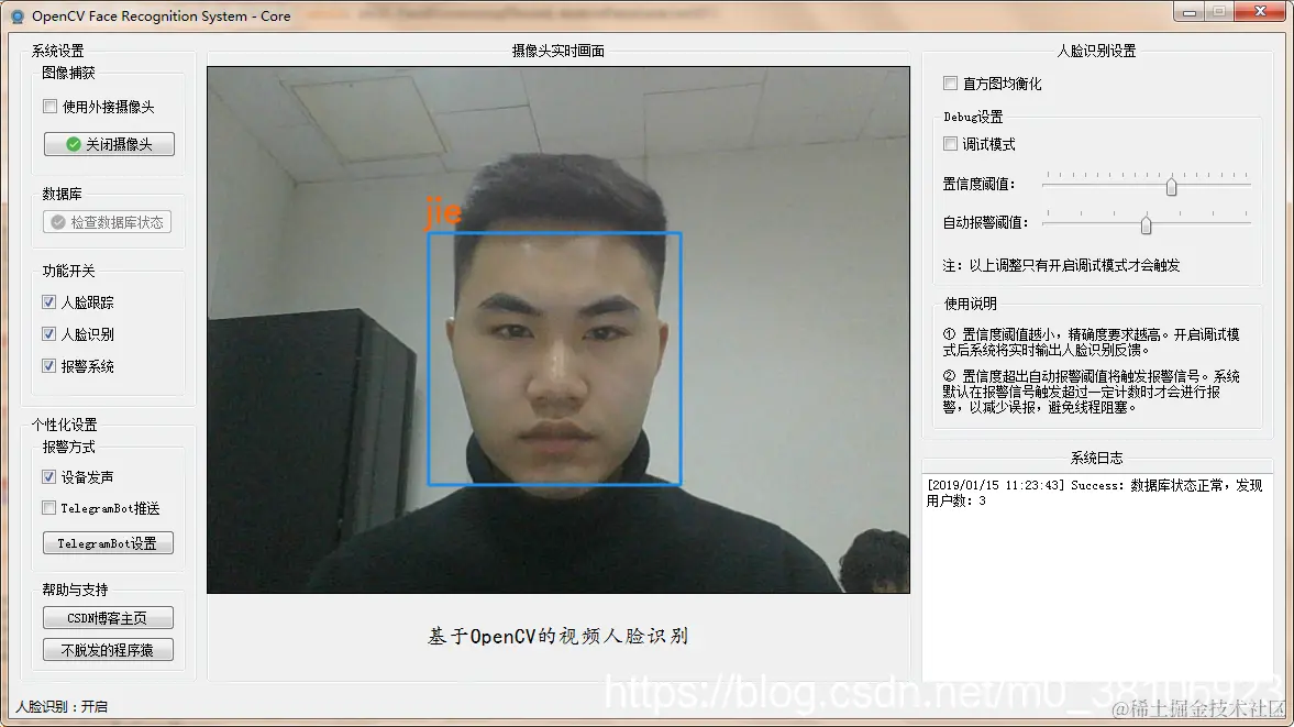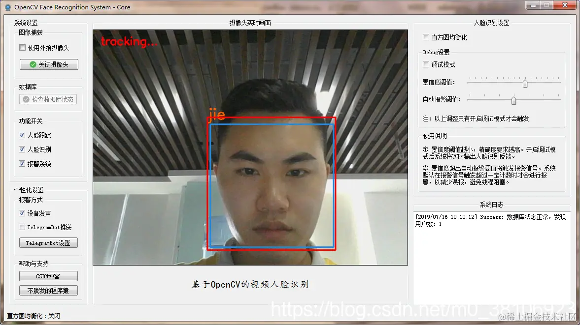 本项目的实现机制:基于OpenCV使用Haar级联与dlib库进行人脸检测及实时跟踪,应用LBPH算法开发了一个功能相对完整的人脸识别系统。系统采用sqlite3进行序列化数据存储,能够对陌生人脸闯入进行报警,并拥有基于PyQt5设计的GUI实现。