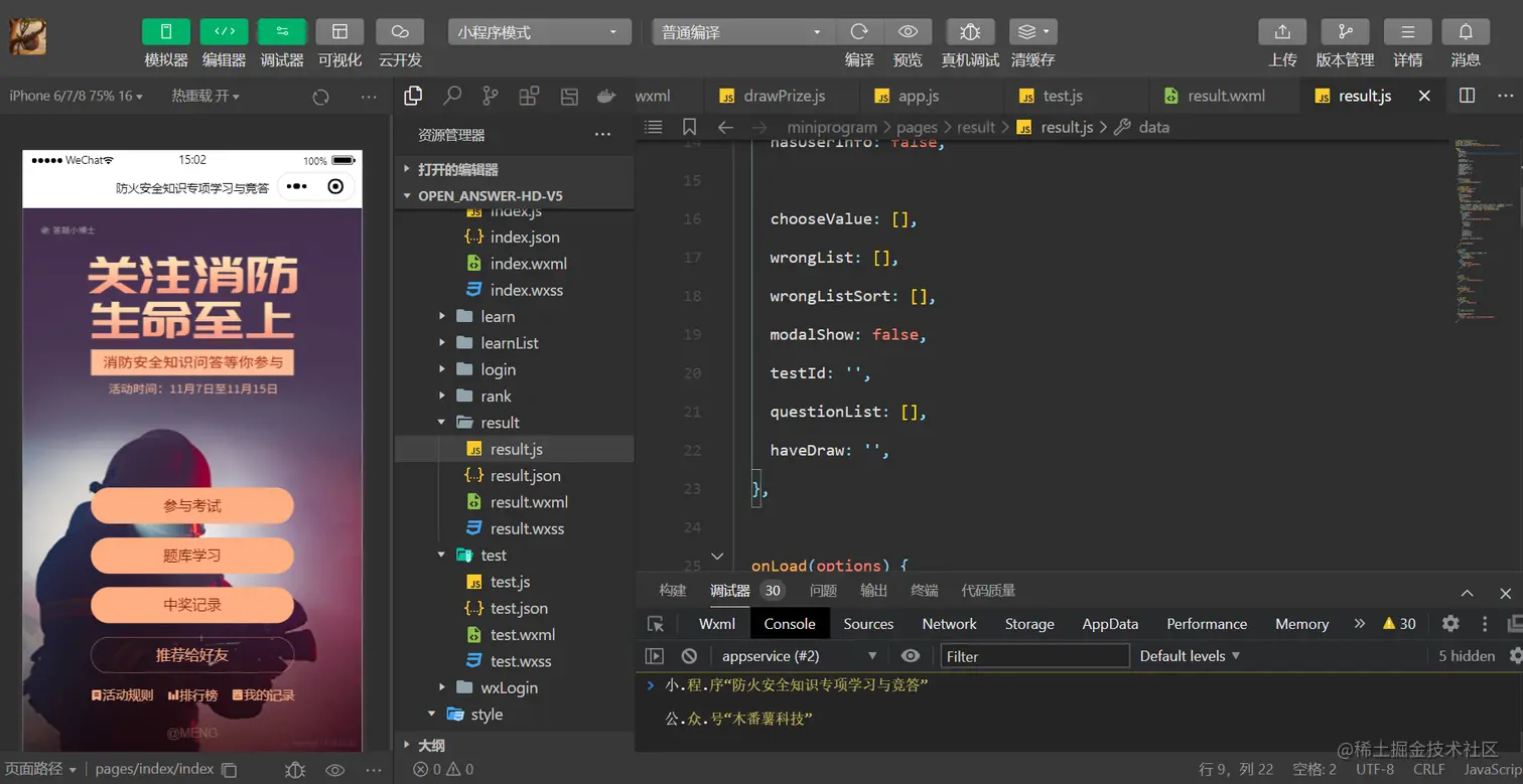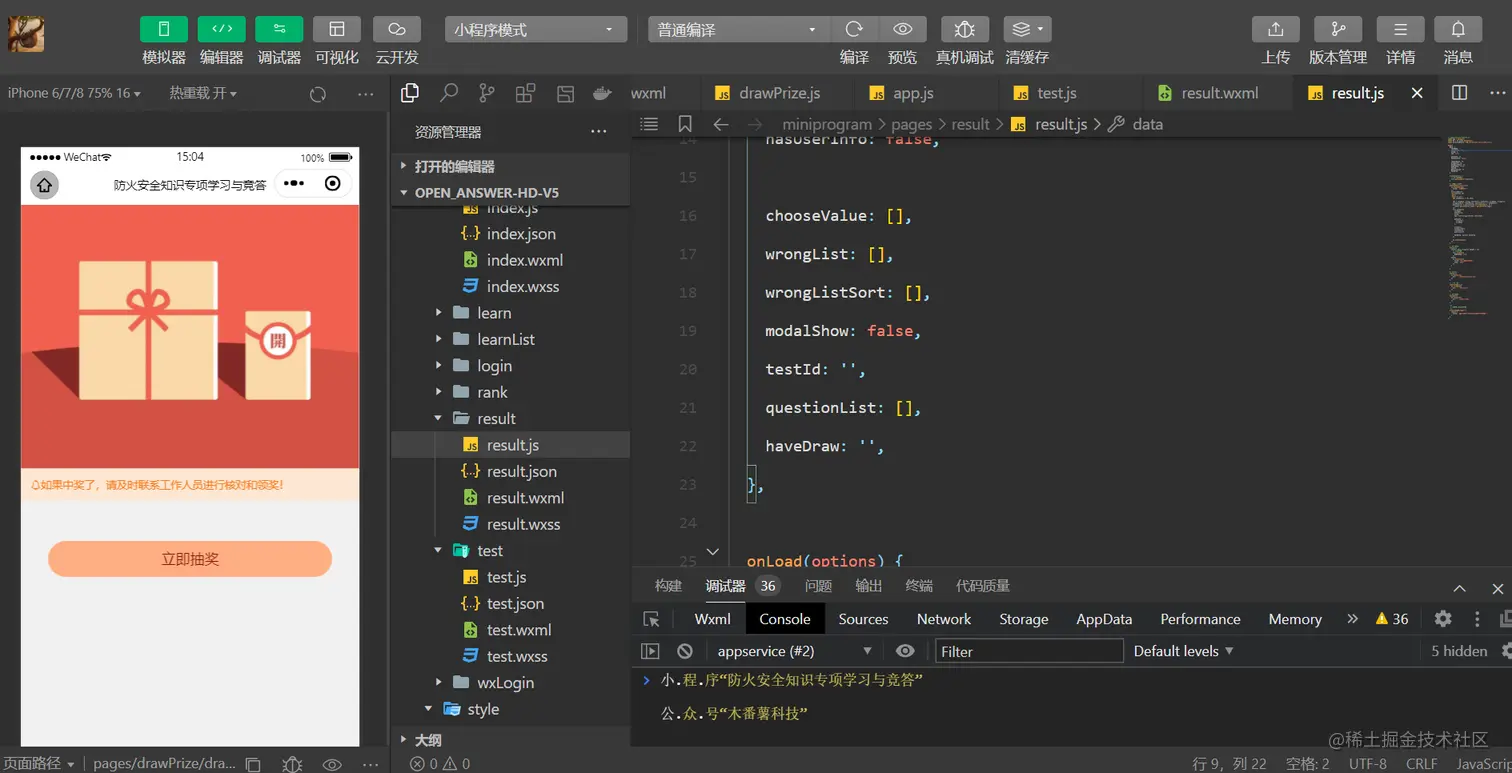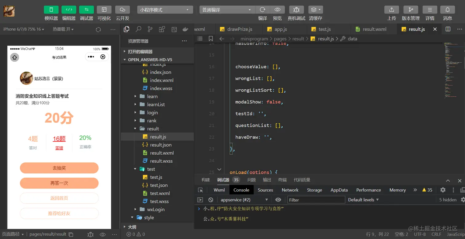 比如,得分为20分或20分以上则可以参与抽奖。当然,我现在是开发调试阶段,可以设置低一点。但实际发布到生产环境,投入真正的知识答题活动应用中,我们一般是设置为得分80分以上则可以参与抽奖,这样比较合理。