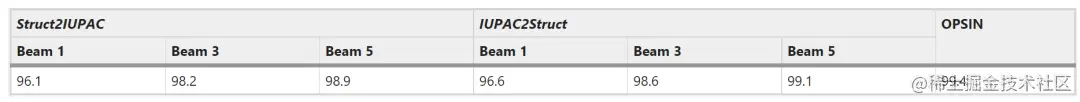 表1:具有不同光束大小的 100, 000 分子测试集上模型的准确度 (%)。