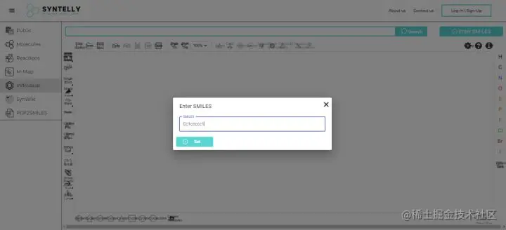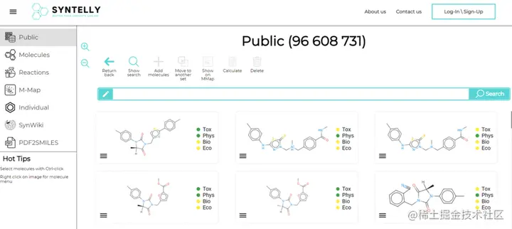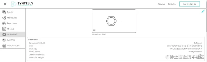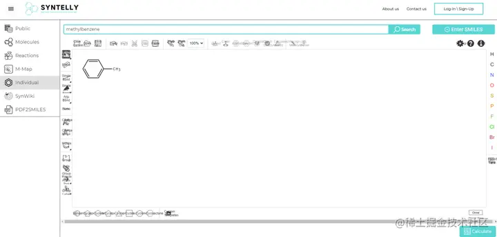 首先, 打开在线开源网址:app.syntelly.com/molecules/1,左侧菜单栏有很多功能选项,在这里选择「Individual」选项,点击搜索框,进入画板。输入需要命名的有机化合物结构,以甲苯(C7H8)为例。