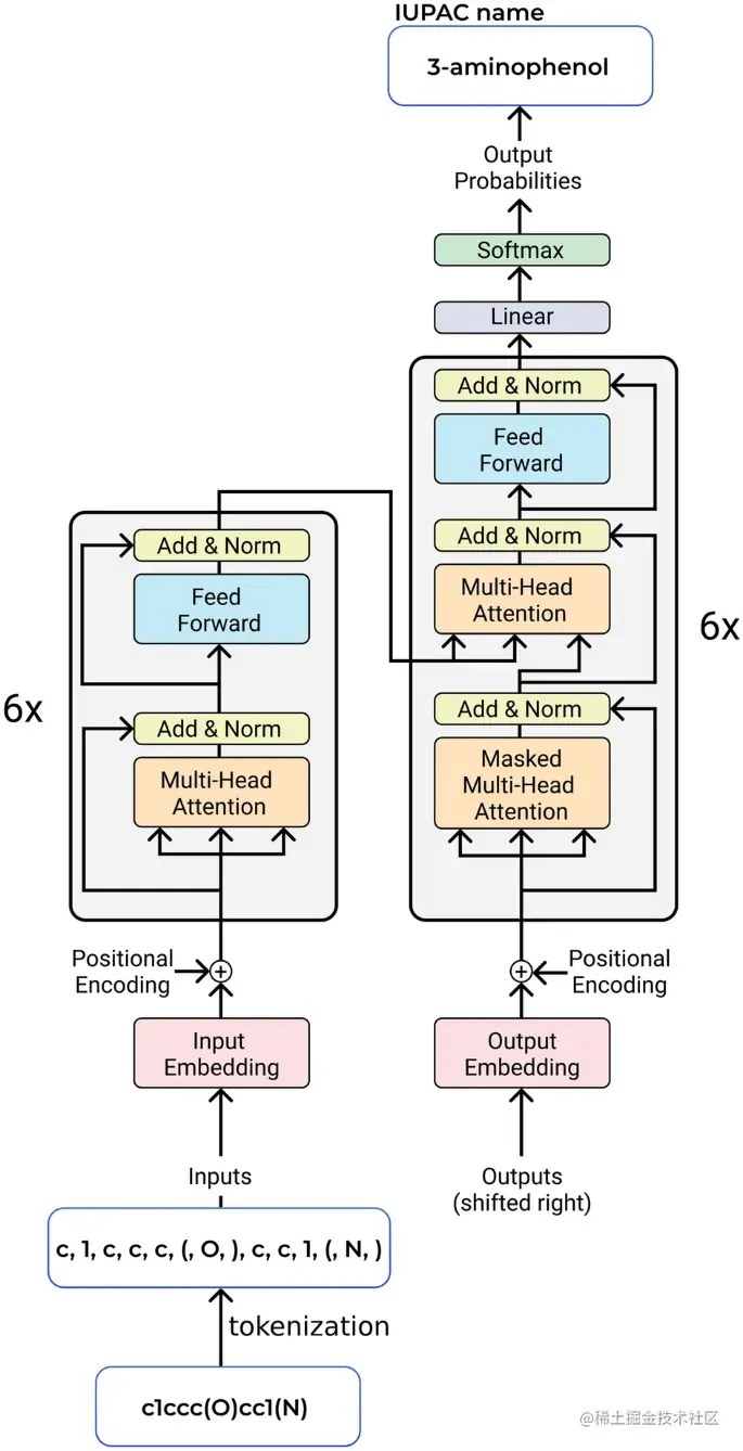 Transformer 模型: 使用由 Google 团队设计的现代神经架构 Transformer ,这是谷歌最初设计的最强大的机器翻译神经网络之一,作为研究的基础,并训练它将分子的结构表示转换为 IUPAC 名称,反之亦然。