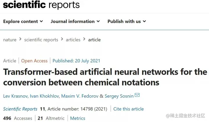 该研究以《基于 Transformer 的人工神经网络,用于化学符号之间的转换》(Transformer‑based artifcial neural networks for the conversion between chemical notations)为题,于 7 月 20 日 发表在《Scientific Reports》杂志上。