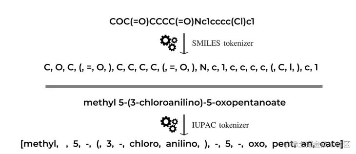 图示:SMILES 标记化(顶部)和 IUPAC 名称标记化(底部)的演示。(来源:论文)