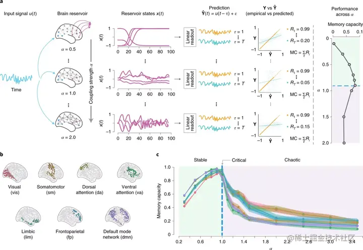 研究发现经验大脑网络在临界点的性能明显优于重连网络,在其他动态状态(稳定和混乱)下,连接组通常具有较低的容量。这些结果表明,当动力学至关重要或处于混沌边缘时,连接组拓扑最适合作为储层库。