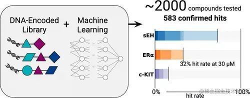 我要举的最后一个例子是我们与 X-Chem Pharmaceuticals (pubs.acs.org/doi/abs/10.…) 合作的 DNA 编码小分子文库的工作。这些小分子可以为开发药物提供起点。使用来自这些 DNA 编码分子库的数据,我们能够构建出令人惊讶的有效机器学习模型,以找到用于药物开发的有前途的小分子。