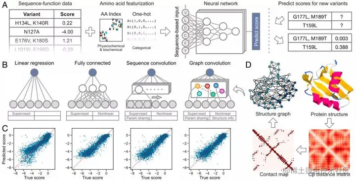 他们测试了多个神经网络架构,包括一个包含蛋白质结构的图卷积网络,从而探索网络的内部表示影响其学习序列-函数映射的能力。该监督学习方法表现出优于基于物理和无监督预测方法的性能。