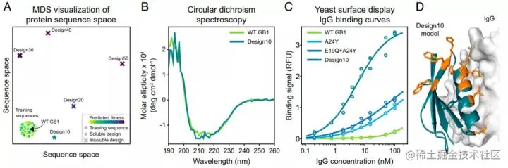 最后,研究人员使用一组监督学习模型来设计五个与野生型距离不同的蛋白质 GB1 结构域序列。他们对这些序列进行了实验表征,发现顶部设计与 IgG 结合的亲和力至少比野生型 GB1 高一个数量级。