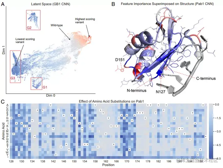 他们探索了该神经网络模型对蛋白质的了解,以及它们如何理解序列-功能映射。卷积神经网络学习蛋白质序列表示,该表示根据序列的结构和功能差异来组织序列。此外,输入序列特征的重要性与蛋白质的三维结构和已知的关键残基有很强的对应关系。