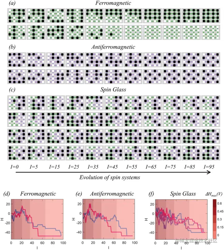 可以观察到,旋转玻璃系统中的「挫败感」。值得注意的是,与使用 BFT 的穷举搜索相比,SA 加速了搜索,需要数量级的低自旋翻转事件。铁磁、反铁磁和自旋玻璃系统的最高加速度分别为≈1365×、≈1260×和≈1310×,而收敛到其基态的系统的平均加速度分别为 ≈850×,≈900×,≈810×。