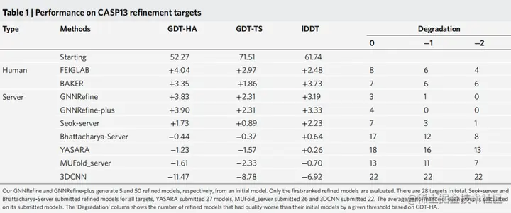 CASP14: 在 37 个 CASP14 优化目标上对 GNNRefine 方法进行测试,并与人工组和服务器组中排名靠前的方法进行比较。研究表明,CASP14 模型比 CASP13 模型更难改进。但总体来说,该方法在 CASP14 优化目标上比 Feig 团队和 Baker 团队的方法表现稍差(可能因为Feig和Baker团队都用了额外的信息),但比其他方法都要更好。