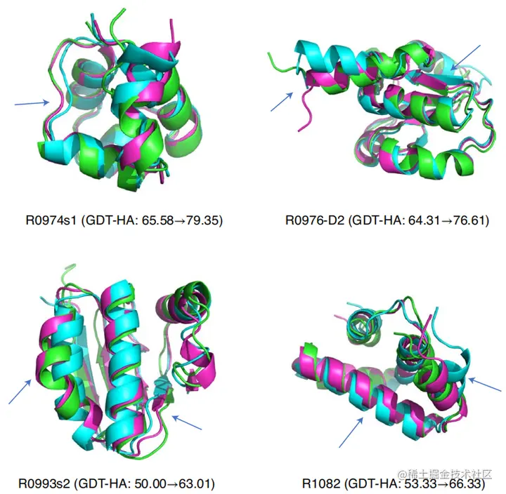 其中有5 个 CASP 测试模型(3 个 CASP13 模型和 2 个 CASP14 模型), GNNRefine把它们的质量提高了至少10分(ΔGDT-HA ≥10)。