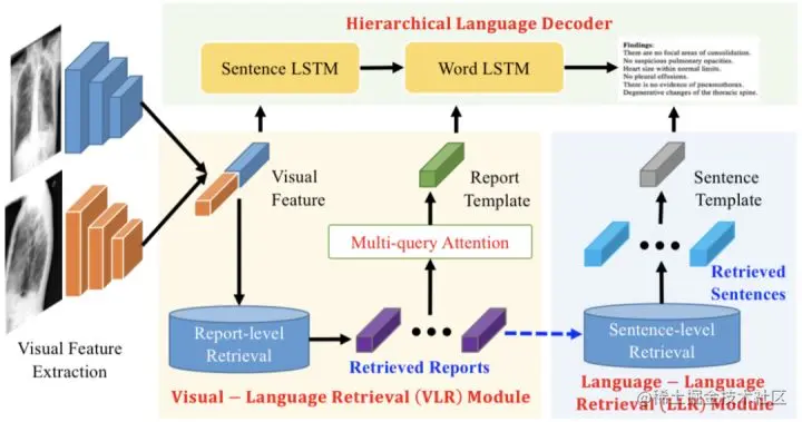 MedWriter 首先使用 VLR 模块来检索给定图像的最相关报告;接着,引入 LLR 模块来根据之前生成的描述检索相关的句子,保证了生成的句子之间的逻辑连贯性;最后,语言解码器融合图像特征和检索到的报告和句子的特征,生成有意义的医学报告。