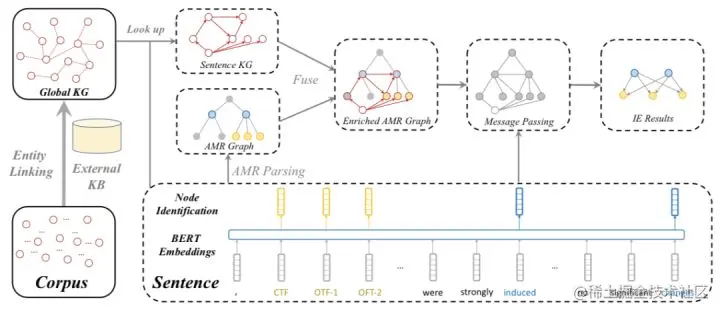 使用边缘条件图注意力网络为生物医学信息提取任务构建抽象含义表示(AMR)图。从外部知识库构建句子级知识图谱,并用它来丰富 AMR 图。