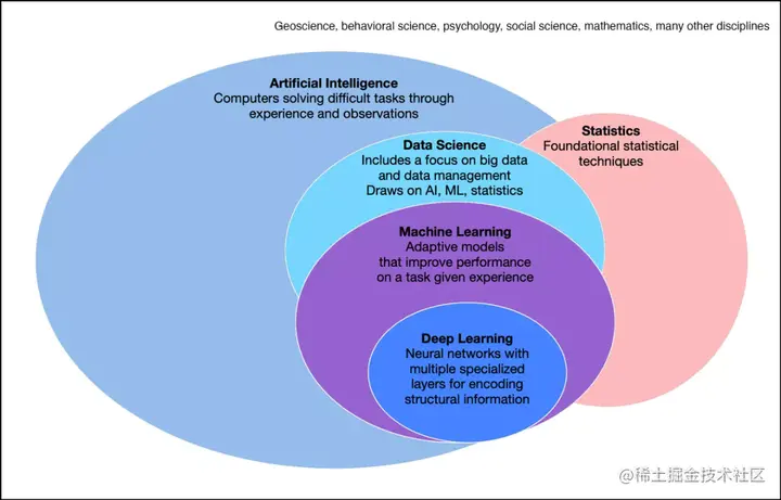 图示:AI 是一个广泛的领域,包括数据科学、机器学习和统计学等其他领域并与之重叠。这些领域的工具被广泛应用于各种科学领域。
